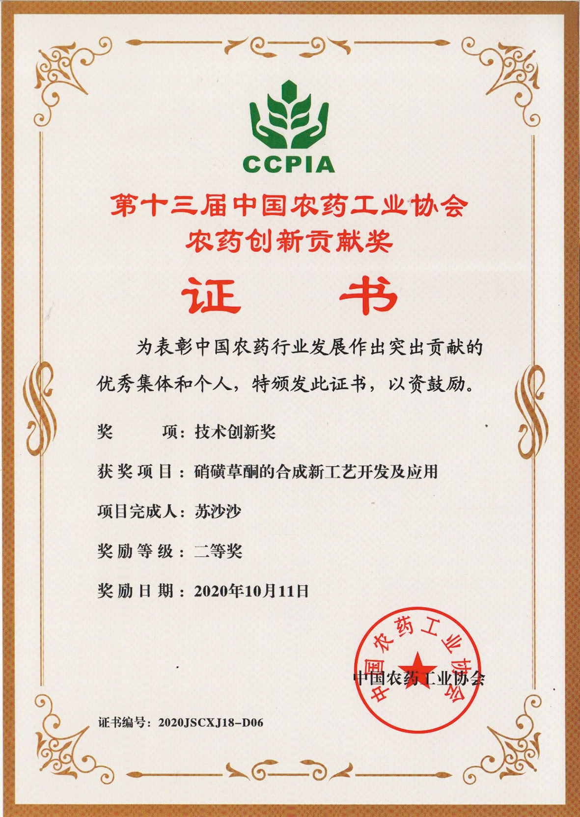 ■2020-11-15 2020-11-05 我公司“硝磺草酮的合成新工藝開發(fā)及應(yīng)用”項目榮獲技術(shù)創(chuàng)新獎
