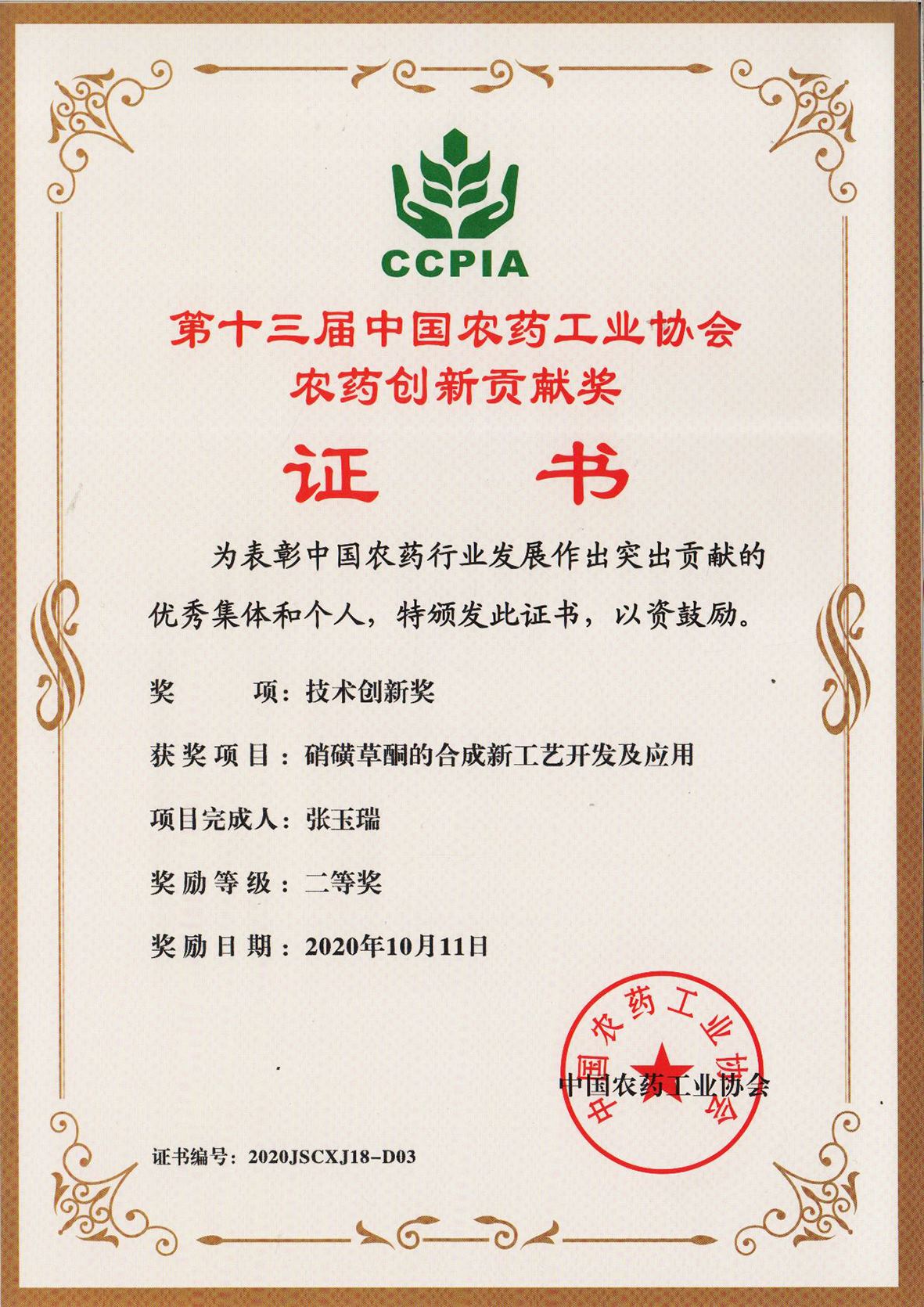 ■2020-11-05 我公司“硝磺草酮的合成新工藝開發(fā)及應(yīng)用”項目榮獲技術(shù)創(chuàng)新獎