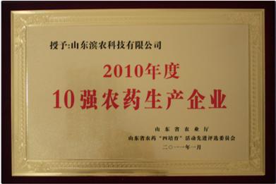 1 月 21 日,山東省農藥檢定所召開了 2011 年山東省農藥管理工作會議,會上我公司被評為 2010 年山東省農藥“四培育”活動 10 強農藥生產企業第一名。