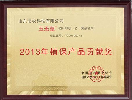 3 月 29 日,在由中國植物保護學會植保產品推廣專業委員會和《農資導報》舉辦的作物解決方案高層研討會(第一屆)暨 2013 年植保產品貢獻獎頒獎盛典大會上,我公司 產品“玉無草”(42%甲·乙·莠去津懸乳劑)榮獲“2013 年植保產品貢獻獎”,