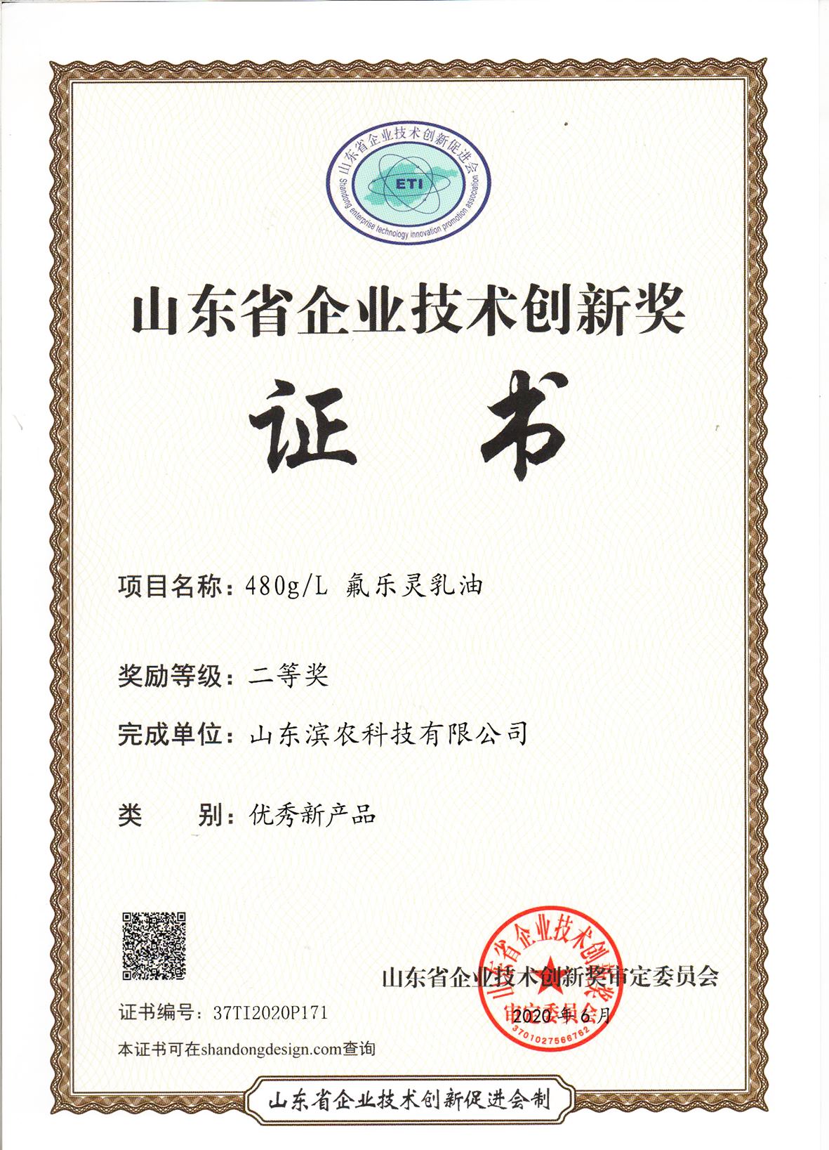 ■2021-04-08 2020-08-05 我公司新產品480g/L氟樂靈乳油榮獲山東省企業技術創新獎優秀新產品二