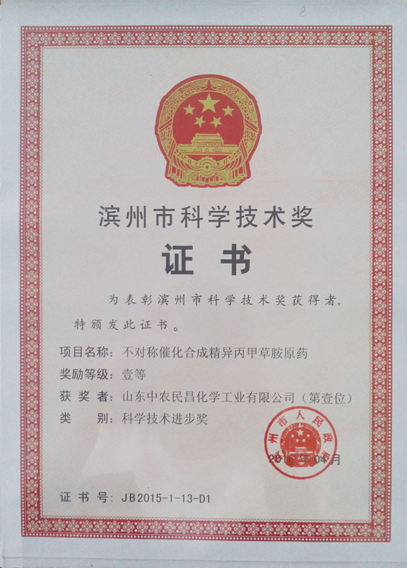山東中農(nóng)民昌化學(xué)工業(yè)有限公司“不對稱催化合成精異丙甲草胺原藥”和“磺草酮·莠去津懸浮劑的開發(fā)及產(chǎn)業(yè)化”項目分別獲得濱州市科學(xué)技術(shù)進(jìn)步獎一等獎和三等獎,山東濱農(nóng)科技有限公司“新型油菜田除草劑二氯吡啶酸·烯草酮WP的開發(fā)研制”項目獲得濱州市科學(xué)技術(shù)進(jìn)步獎三等獎。